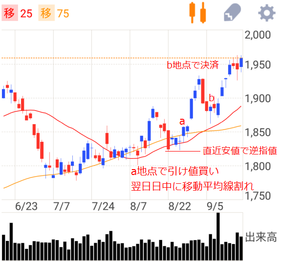 a地点(8/28)に75日移動平均線を越えて陽線で引けようとしたため引け成で買い。