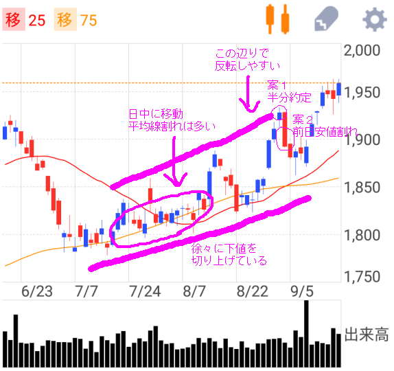 今までのローソク足を見ても分かるように、日中に75日移動平均線割れが多いように見えます。